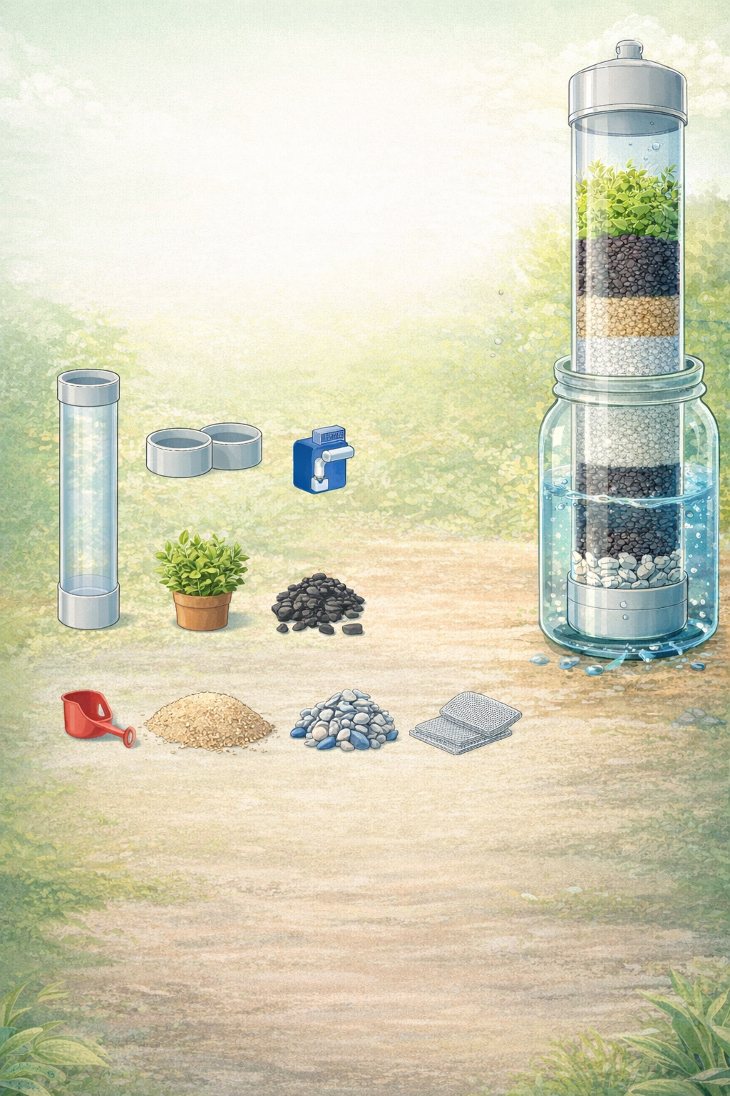 Water enters dirty at the top and exits clean at the bottom — passing through four carefully chosen layers that each do a specific job. The clear tube lets in light so the moss stays healthy and alive.